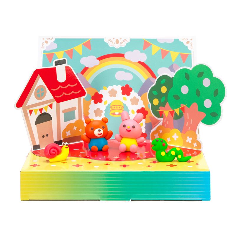 本のかたちをした特製パッケージを開くと、目の前に飛び出すのは、カラフルで楽しいポップアップの世界。